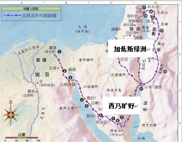 加低斯是一个绿洲,接近迦南边境,由西乃山起行到加低斯,共十一天路程(图五)。