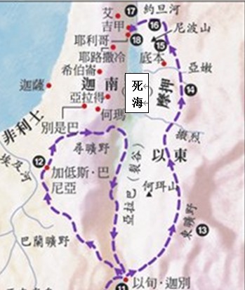 以色列人飘流了差不多四十年后,神带领他们绕到死海北面。旅程中他们曾打败几个王,包括约但河东的两个王,所攻占的领土后来成为两个半支派(流便、迦得,东玛拿西)的地业(民32章)。以色列人终抵死海北面约但河边,在耶利哥对面的摩押平原安营,等待神的指示。